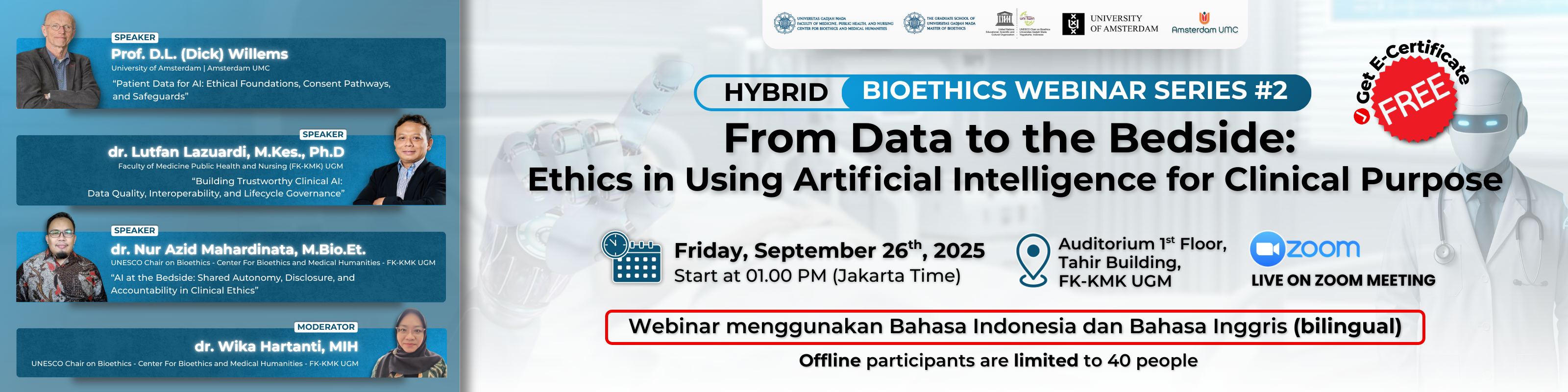 🗓 Rabu, 16 April 2025 🕐 Pukul 13.00 – 14.30 WIB 🔗 Zoom: ugm-id.zoom.us/my/raboan 🆔 Meeting ID: 225 997 1000 | Passcode: bioethics 📺 Live di YouTube: CBMH UGM | https://www.youtube.com/live/gNEaz0gN_oA