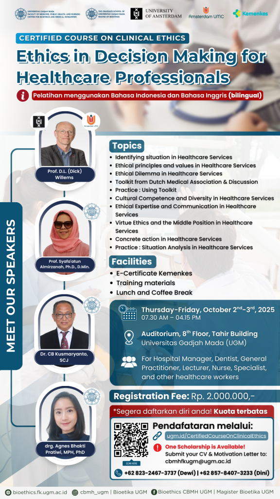 ✨ HELP COURSE BATCH 7 – 3RD SERIES ✨ "Health and Medical Research" 📅 18–26 Agustus 2025 📍 Online via Zoom 🗣 Pelatihan dalam Bahasa Indonesia HELP Course Batch 7 Seri 3 kembali hadir! 🚀 Bahas topik penting mulai dari Introduction to Research Ethics, Informed Consent, Critical Thinking on Biomedical Ethics Principles, hingga Bioethics of Using AI in Research bersama narasumber ahli dari berbagai bidang. 🎯 Terbuka untuk: Mahasiswa, civitas akademika, praktisi kesehatan, tenaga kesehatan, dan umum. 🎁 Benefit Peserta: ✅ E-Sertifikat ✅ Transfer kredit ke Program Studi Magister Bioetika UGM ✅ Materi kursus 💰 Biaya Pendaftaran: Mahasiswa Magister Bioetika UGM: Rp 500.000 Civitas Akademika FK-KMK UGM: Rp 500.000 Umum: Rp 2.500.000 📲 Daftar sekarang: linktr.ee/Help7Seri3 📌 Info lebih lanjut: 0823-2467-3737 (Dewi)
